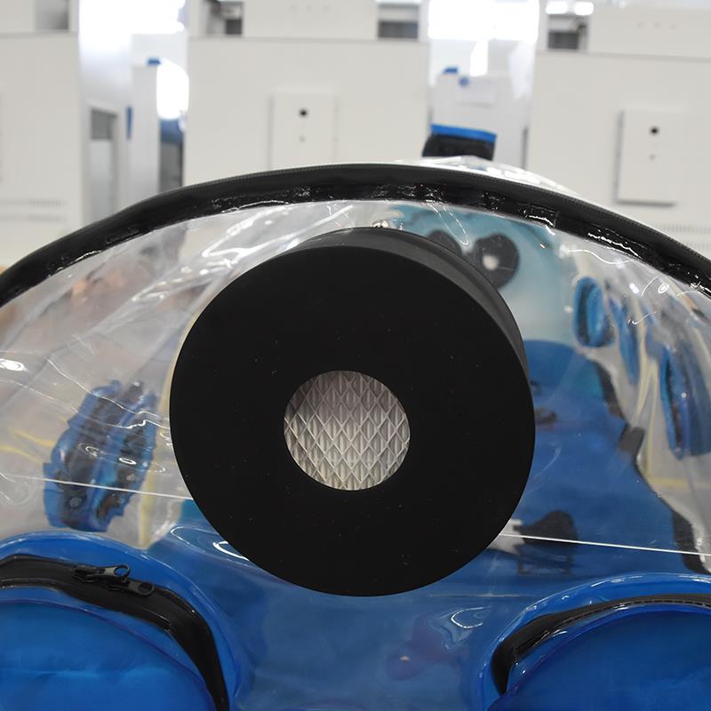 【标准配置】隔离舱透明舱体1件、高效过滤器3件(3个滤毒罐)、压生成系统1个、一次性PE手套5套、锂电池1个,充电器1个、担架(选配)。