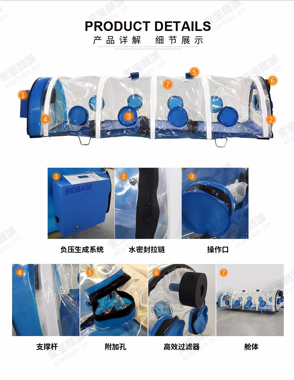 【标准配置】隔离舱透明舱体1件、高效过滤器3件(3个滤毒罐)、压生成系统1个、一次性PE手套5套、锂电池1个,充电器1个、担架(选配)